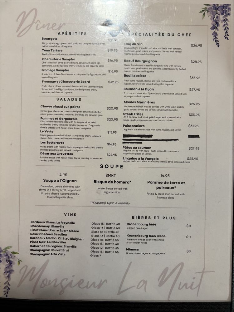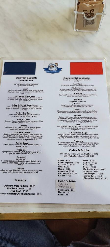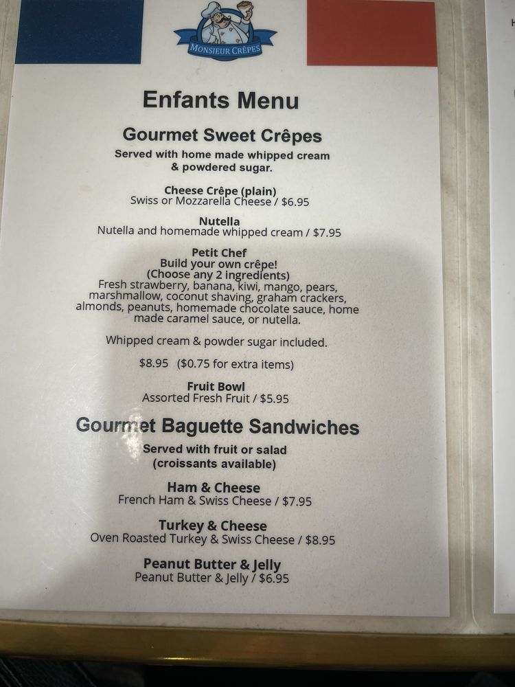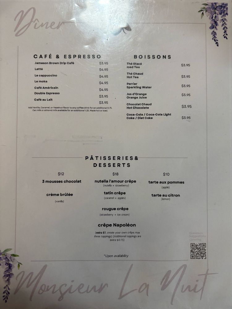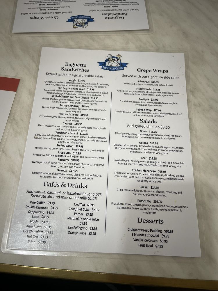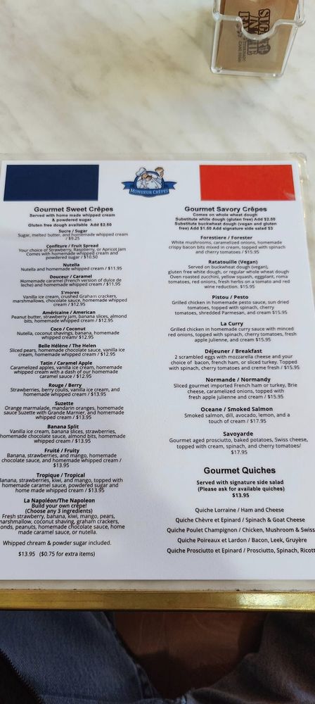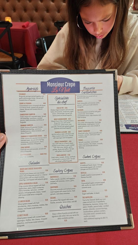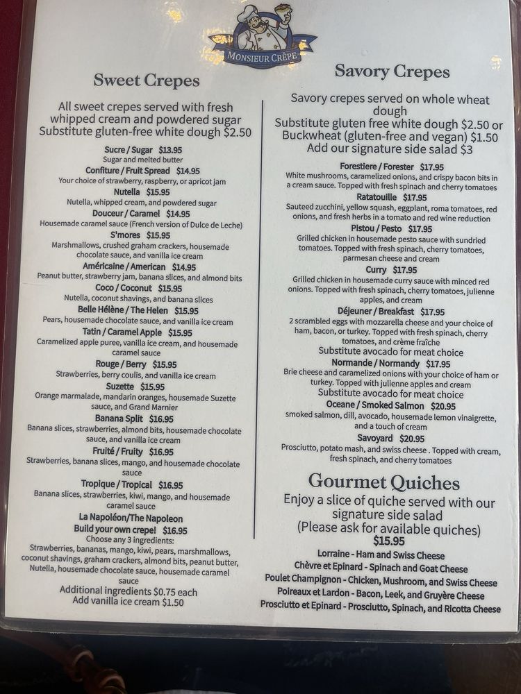 Reviews highlight the scrumptious curry and pesto crepes, as well as the delectable nutella/strawberry crepe for dessert. The menu also features savory options like coq au vin and beef bourguignon, all bursting with flavor. The café's chic decor and attentive service contribute to a memorable dining experience. With live jazz performances occasionally enhancing the ambiance, Monsieur Crêpe Café offers a unique and enjoyable dining experience for all.